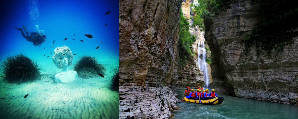 Adventure 2 days tour : Rafting in Osumi Canion, Paragliding from Llogara National Park and Diving in crystal waters of Dhermi Beach.